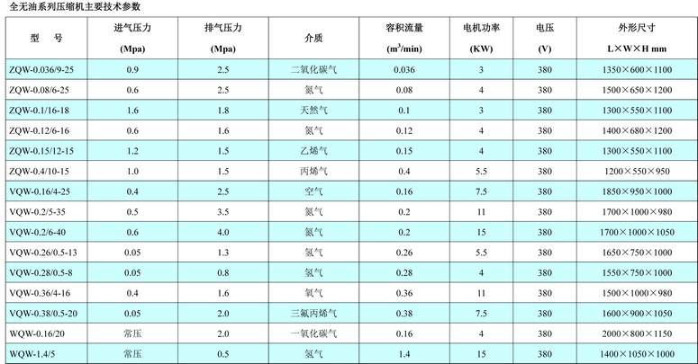 全無(wú)油系列壓縮機(jī)為往復(fù)活塞式。該系列壓縮機(jī)為公司自行研制生產(chǎn)的產(chǎn)品。該系列產(chǎn)品具有結(jié)構(gòu)緊湊、振動(dòng)小、噪音低、運(yùn)行平穩(wěn)、使用方便、安全可靠等特點(diǎn)。由于該系列產(chǎn)品為全無(wú)油潤(rùn)滑,從而保證壓縮機(jī)輸送出去的氣體不含油。全無(wú)油系列壓縮機(jī)已使用于氮?dú)?、氫氣、天然氣、三氟丙烯氣等氣體的增壓和輸送。